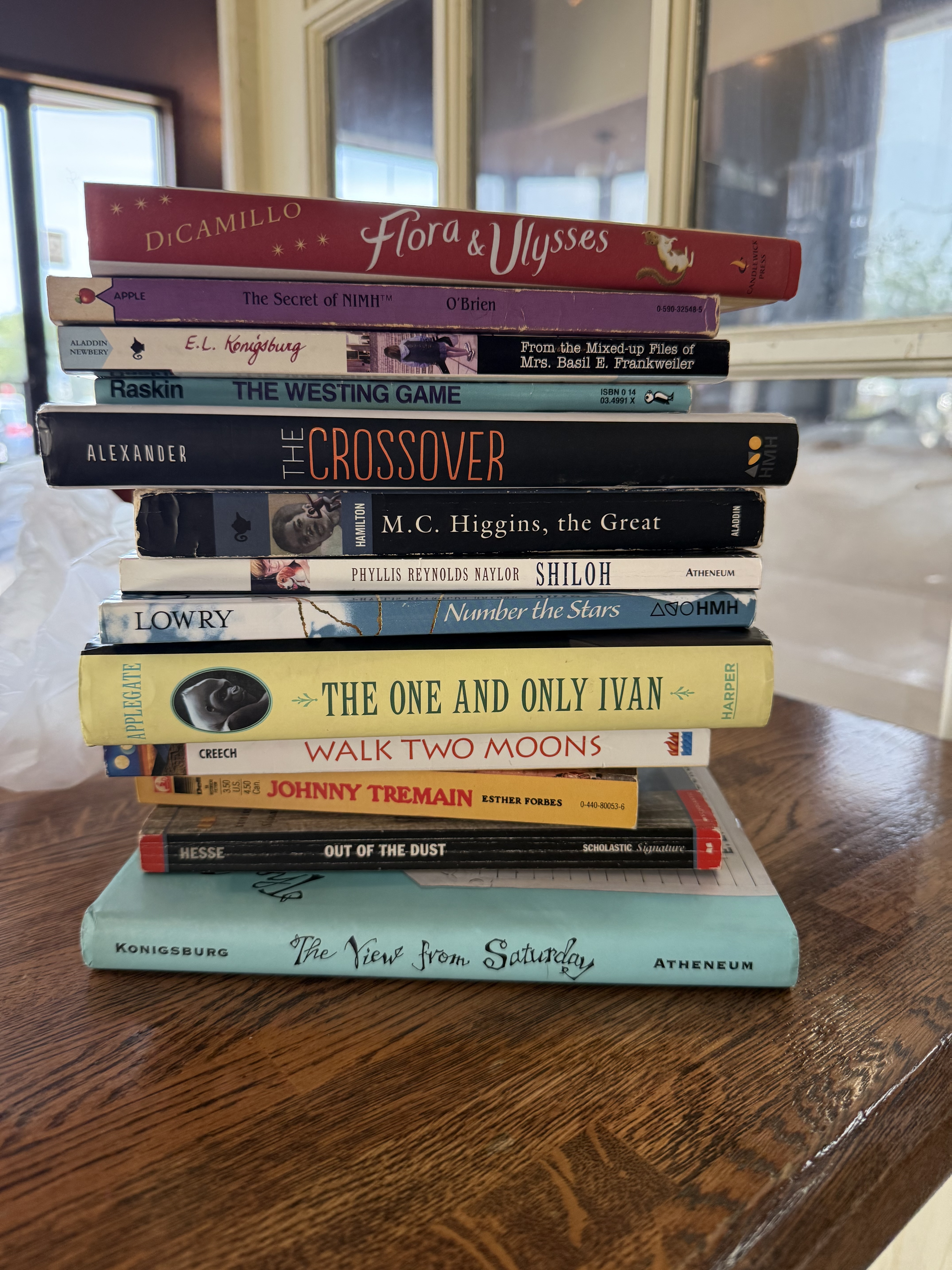 My sister and I were checking out a recently-opened used bookstore while I was visiting last week, and they had so many Newbery winners on the shelves, so I decided to make a meaningful dent in my lifelong goal to own (and read) every Newbery winner. The award began in 1922, so there are 103 books on the list. I’ve read around 20 of them (specific number unclear because a few of the titles look really familiar, but I can’t recall the details), and I bought 13 of them last week!