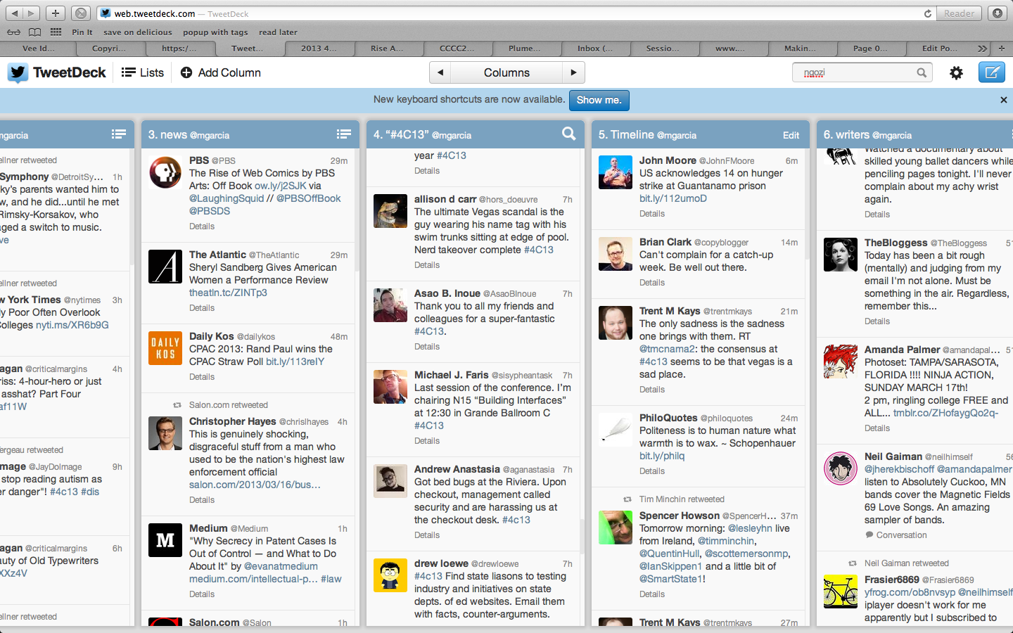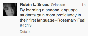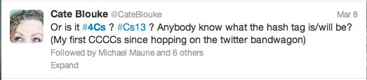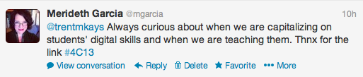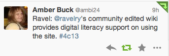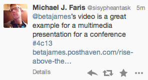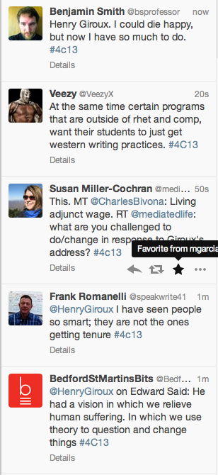 Kyle Stedman, Bill Wolff, and Tekla Hawkins dove into remix, twitter, fanfiction and theories of composition and community in K1, which was well attended and heavily tweeted even though it was in the last time slot of the conference. You can watch video of it here. Stedman’s presentation was especially novel. He played short audio clips and explained the phenomenological contributions of sound to composition (and confounded the room by pointing out that lasers don’t make the expected swishing or pinging sound that science fiction movies have led us to expect). Bill Wolff examined the twitter community of Bruce Springsteen fans and asked “What are tweeters doing?” He identified practices that historicize, notify, and perpetuate community norms and information as well instances that build intertextual communications. Tekla Hawkins suggested that the increasing popularity of fanfiction demands the need for closer attention from academics and that fan compositions work as a remix practice, drawing from the canon as a database and creating something new.