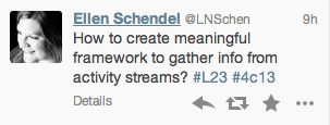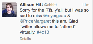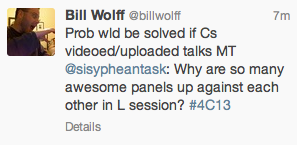 I squeezed in just a few minutes late to the packed presentation room for B5 – PLZ RT: Networks, Performances, and Games on Twitter with John Jones, Cate Blouke and Michael Widner. I only caught the end of Jones’ presentation but was intrigued by his argument about how people use hashtags on twitter to communicate subtle messages and how even though the alliances through twitter hashtags may be temporary (perhaps even contentious), that doesn’t necessarily mean that they have failed. Cate’s presentation in five acts with the live twitter stream behind her was entertaining and thought provoking: asking us to consider how we might perform our academic identities with instead of for, blurring that line between writer, text, performer and audience, creating a “theater without spectators.” Widner had planned a twitter zombie game, but his repeated testing of the program earlier that morning ended up locking him out by the time the conference started. Instead he walked us through the code, explaining the few categories necessary to create a social game and the beauty of writing code for both machines and humans to read. Coding as creative writing.